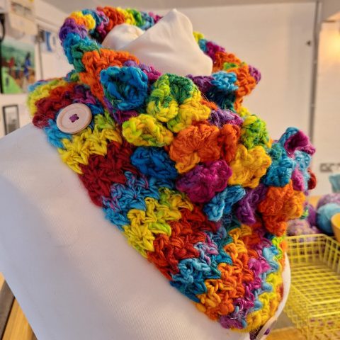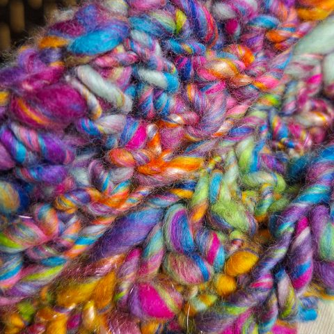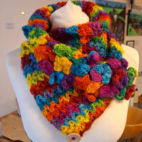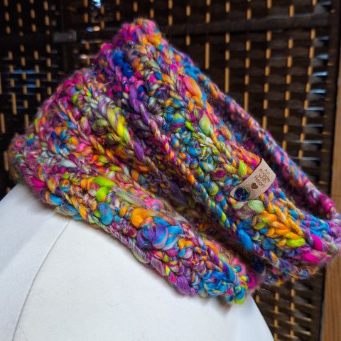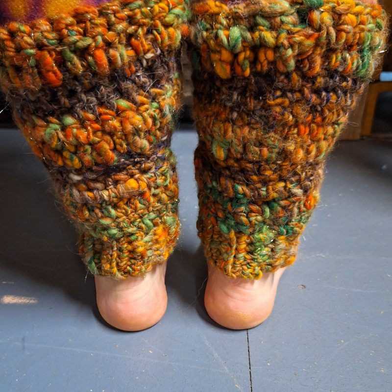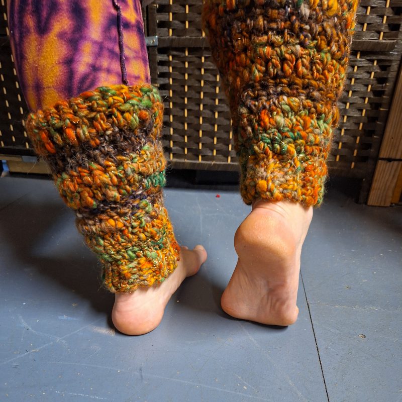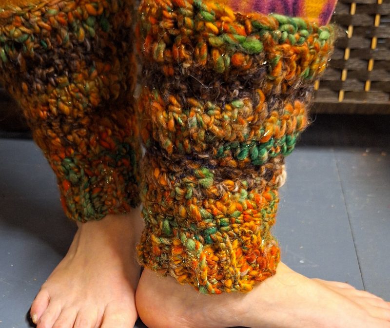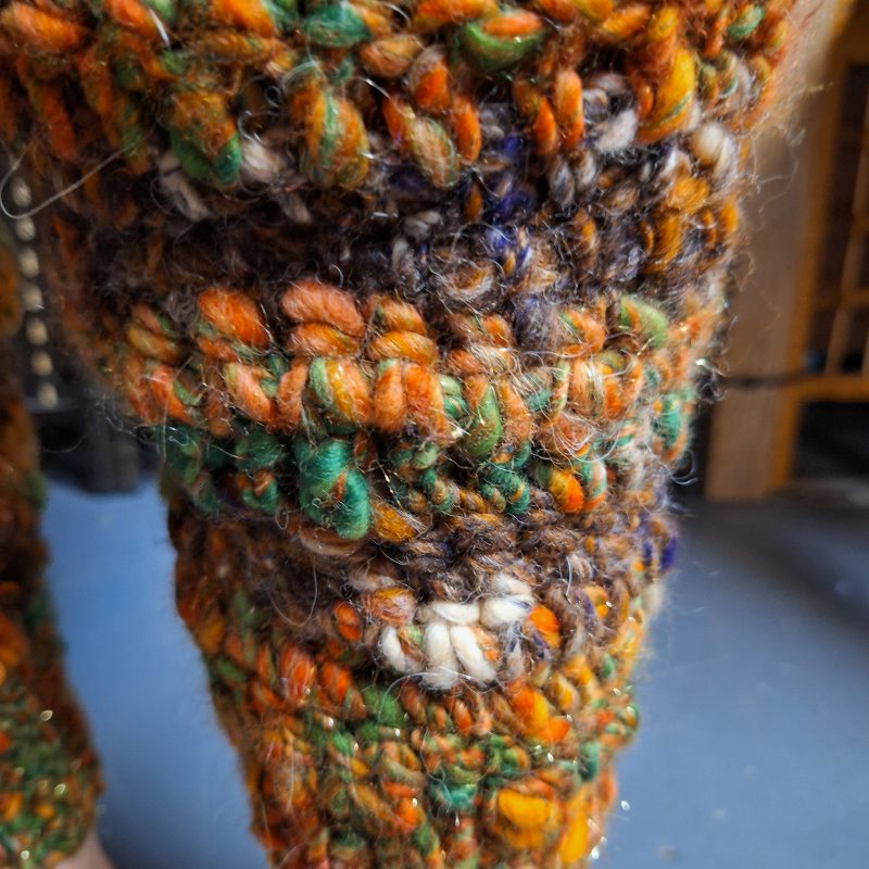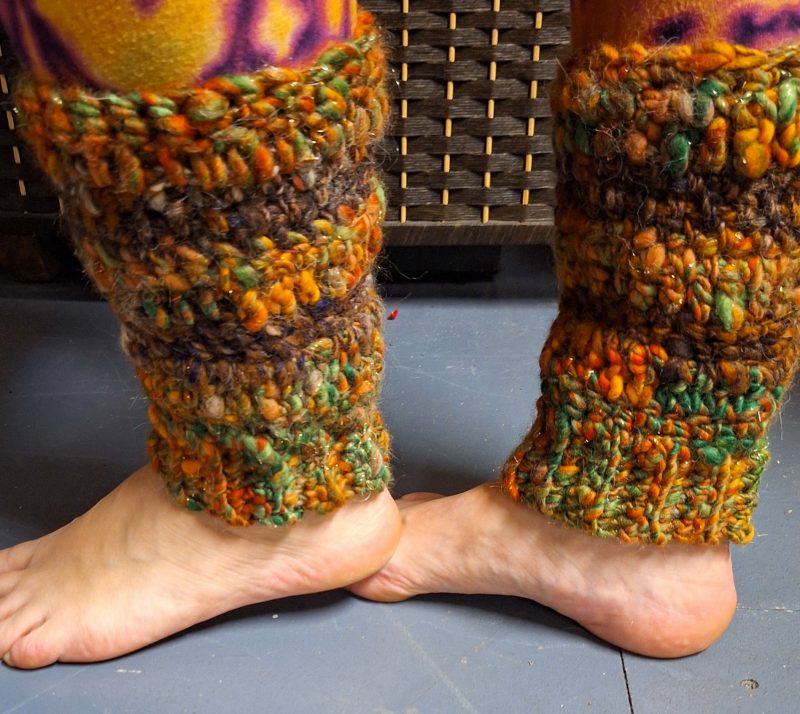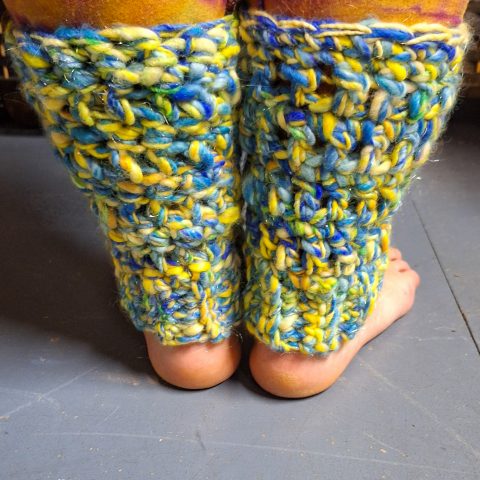 This beautiful pair of leg warmers encompasses the turn of the season with a very autumnal feel, they are hand blended, hand spun and crocheted with Merino, Corredale and Firestar fibres.