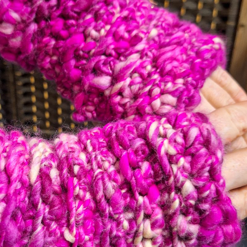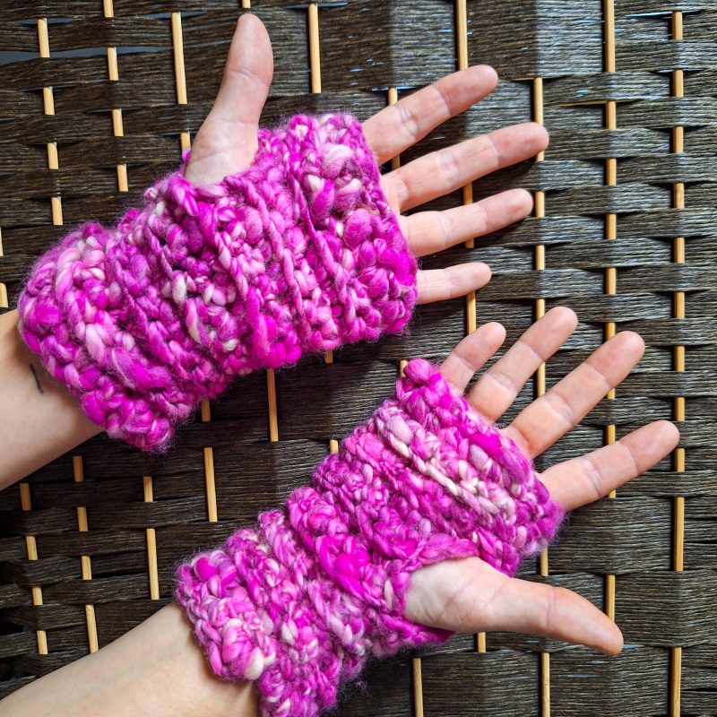These lovely chunky wrist warmer gloves are hand made from Merino wool and Firestar fibres.