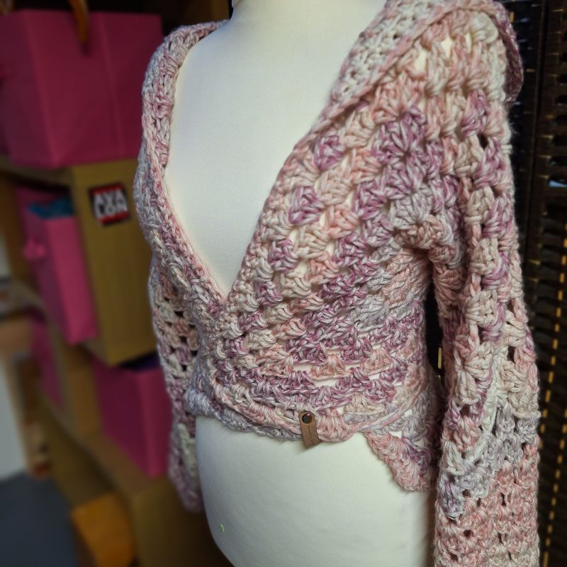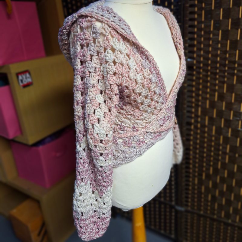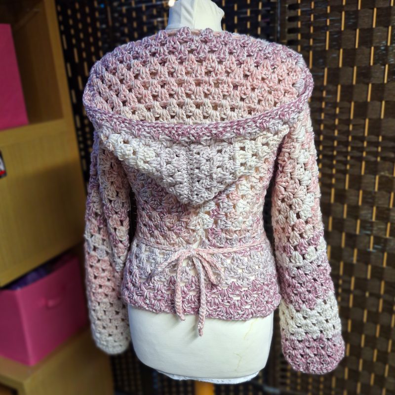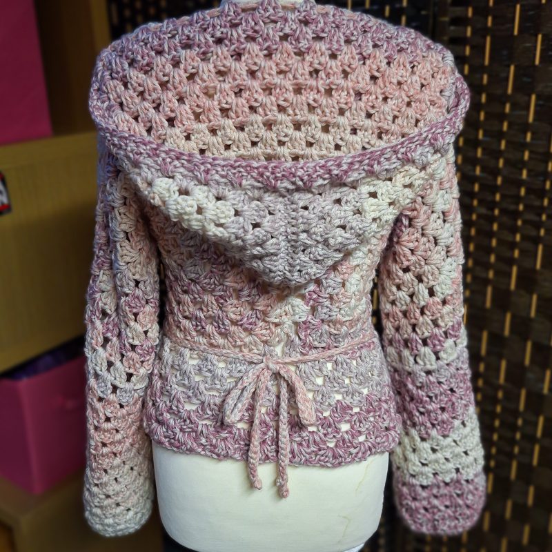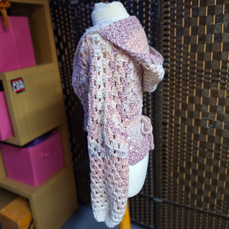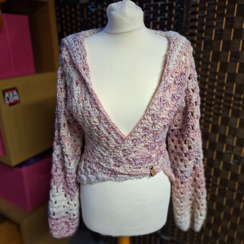 Completely unique, one of a kind and super soft. It has beautiful puff sleeves, a large lovely hood, and wraps around to give a gorgeous V shaped front.